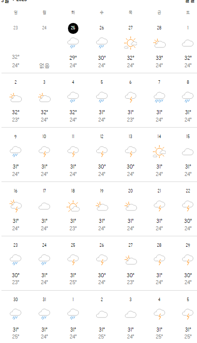 | 3월 말 | 31℃ | 24℃ | 90mm |
