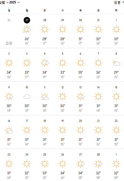 2025년 2월 치앙마이는 건기 시즌으로, 날씨가 매우 쾌적한 편입니다. 평균 기온은 낮 동안 28~32℃로 따뜻하지만, 아침과 저녁에는 15~20℃까지 떨어져 선선한 느낌을 줍니다. 비가 거의 내리지 않기 때문에 야외 활동을 즐기기에 적합한 시기입니다.