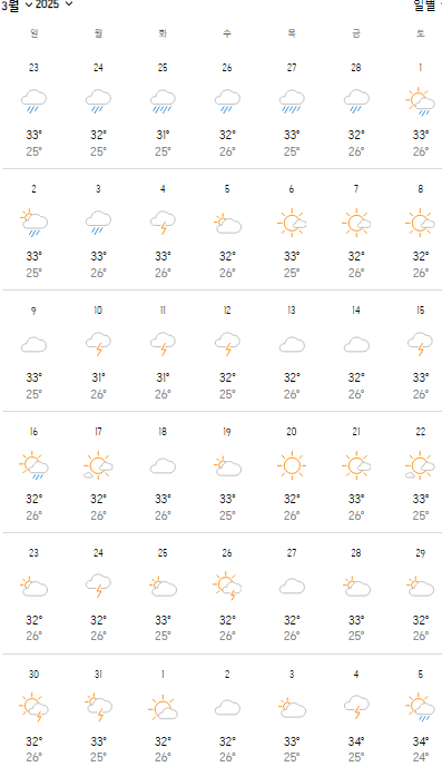 | 29℃ | 34℃ | 25℃ | 50mm 미만 | 약 70% | 맑음, 가끔 흐림 |
