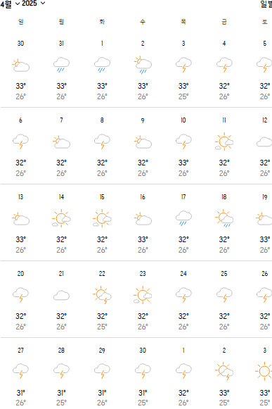 | 평균 최저 기온 | 평균 최고 기온 | 강수량 | 습도 |