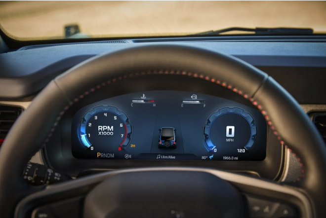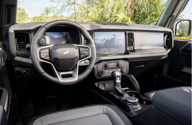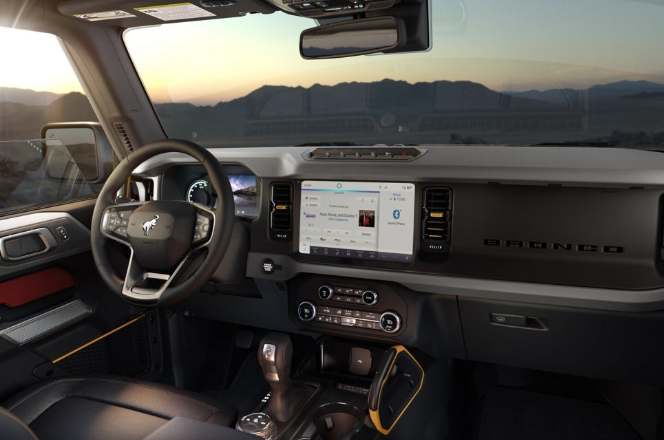 브롱코의 내부는 견고하면서도 세련된 디자인을 제공합니다. 내구성이 뛰어난 소재를 사용하여 오프로드 주행 환경에서도 차량 내부를 보호하며, 인체공학적으로 설계된 시트와 넓은 내부 공간은 장거리 주행에도 편안함을 제공합니다.