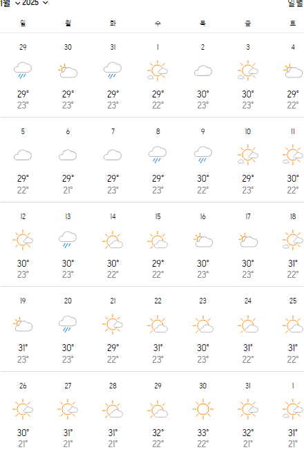 | 1월 1일 - 1월 7일 | 21°C | 29°C | 맑음 | 10% | 70% |