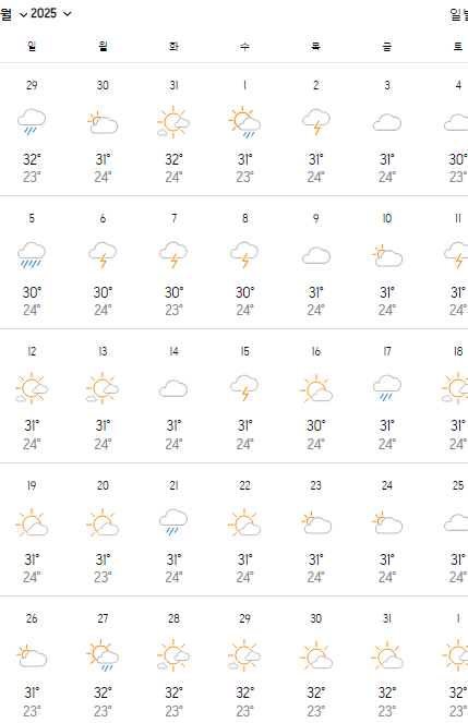 | 낮 기온 | 28-32°C | 10-20mm | 맑음 |