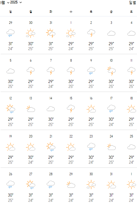 | 1월 15일 | 25℃ | 31℃ | 15% | 65% | 맑음 |