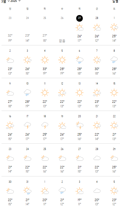| 2025년 3월 | 22~25℃ | 11~14℃ | 40~50mm |