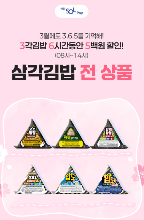 | 신한 SOL Pay | 500원 할인 | 삼각김밥 |