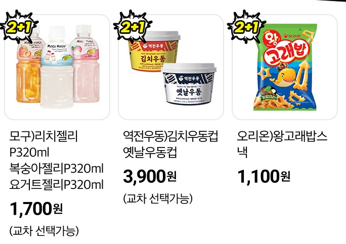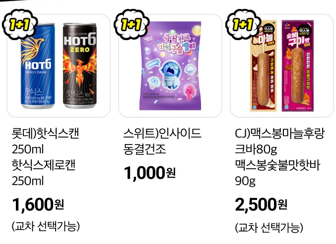 | 1+1 행사 | 젤리, 프레첼, 단백질바, 비비고 만두 |