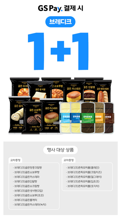 GS Pay로 결제하면 브레디크의 다양한 빵을 1+1 혜택으로 구매할 수 있습니다.