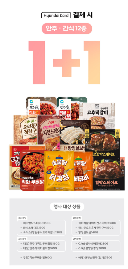 편의점에서 간단한 안주와 간식을 즐기는 분들을 위한 현대카드 1+1 행사도 준비되어 있습니다.