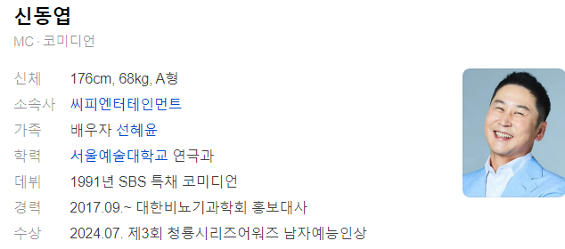 키는 176cm, 몸무게는 68kg이며, 혈액형은 A형입니다. 신동엽은 MBTI 성격 유형 검사에서 ESFP로 분류되며, 사람들과 어울리기를 좋아하고 유머 감각이 뛰어난 성격으로 알려져 있습니다.
