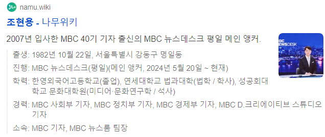 mbc 앵커 조현용 프로필 / 나이 / 고향 / 학력 / 기자 / 가족 / 논란 / 나무위키